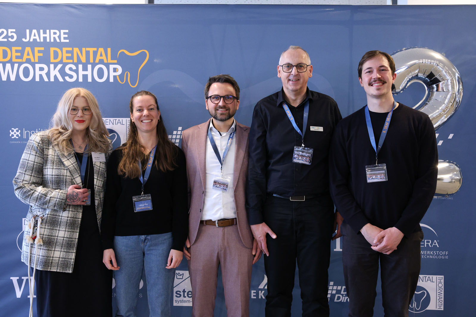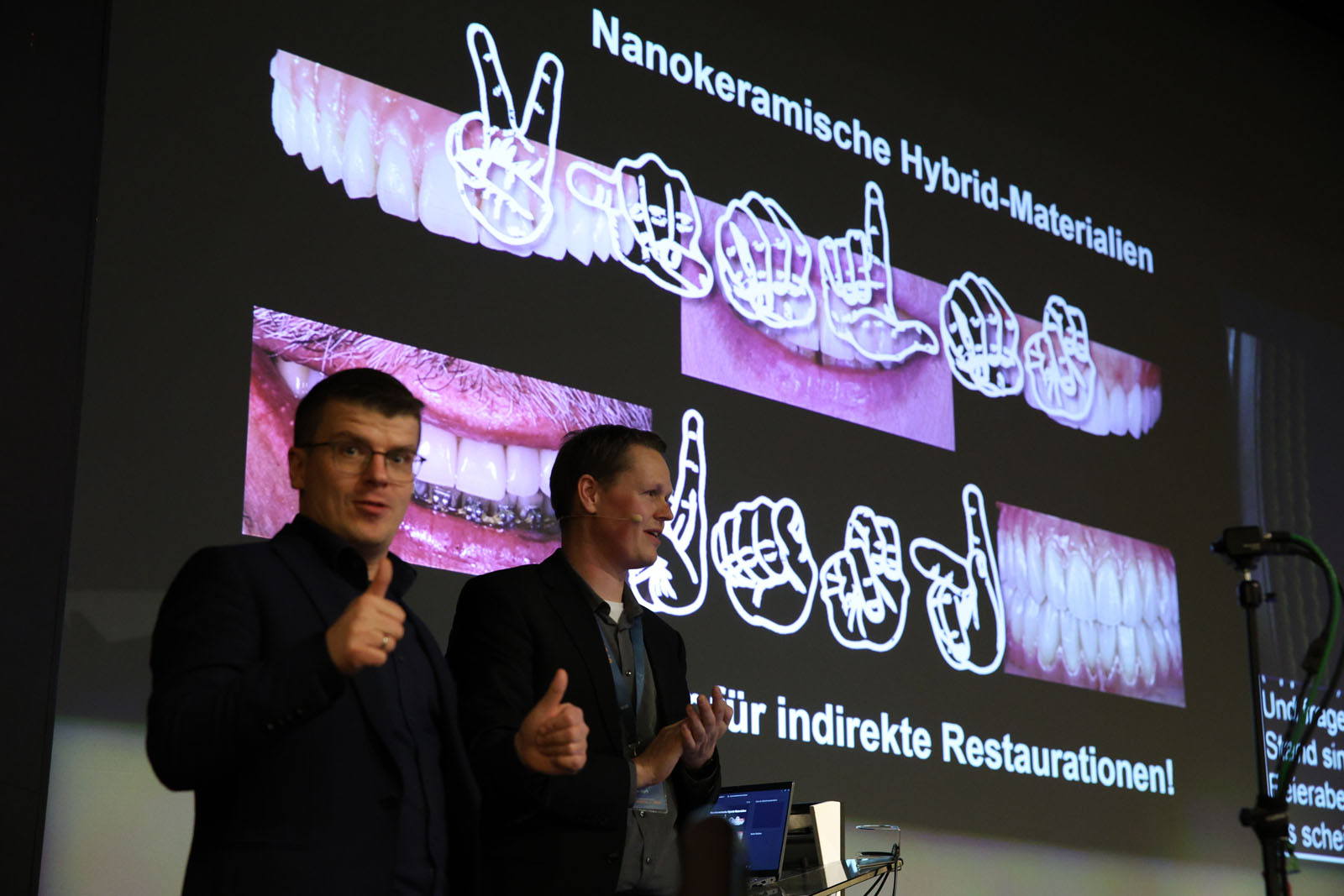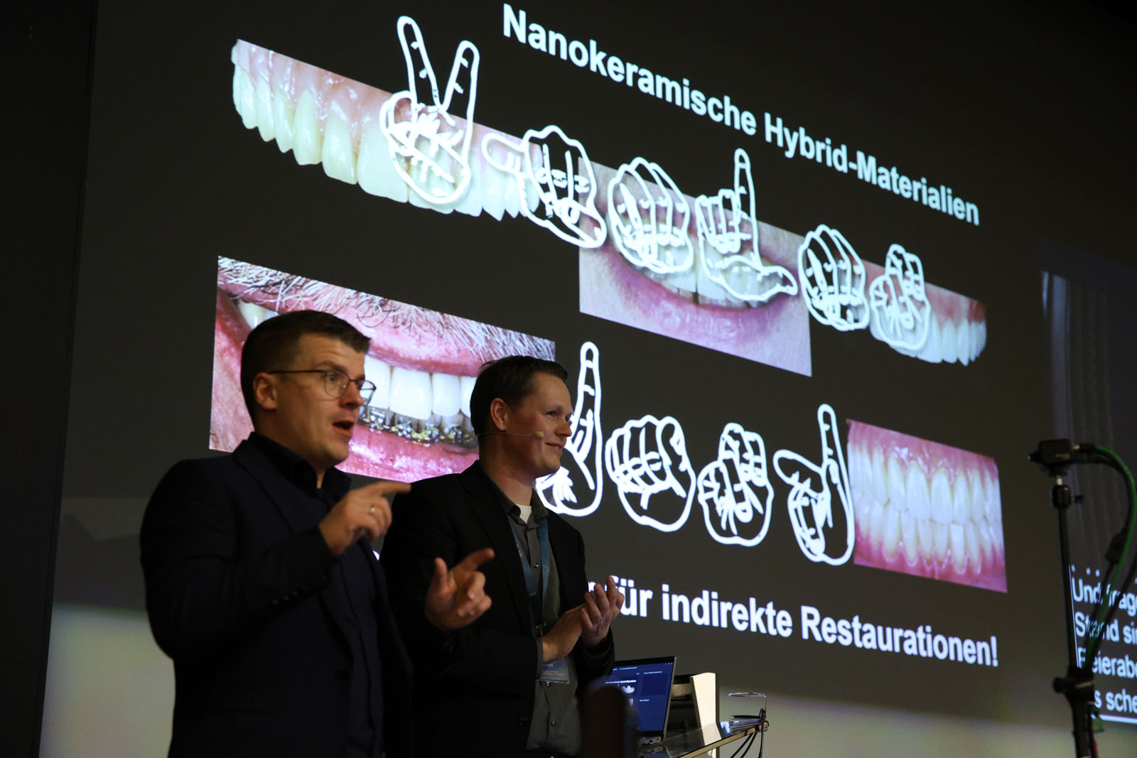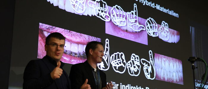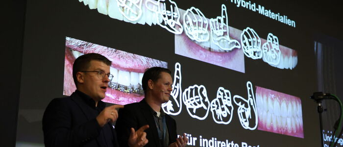 Damit alle Inhalte verständlich sind, sorgen vier Gebärdensprachdolmetscher und zwei Schriftdolmetscher für eine barrierefreie Kommunikation in nationaler und internationaler Gebärdensprache sowie in Schriftform. Zusätzlich unterstützen 15 studierende Gebärdensprachdolmetscher der Universität Hamburg die Fachberatungen an den Infoständen der Dentalfirmen. „Die Studierenden sammeln bei uns wertvolle Praxiserfahrung für ihre Zukunft“, so Thorwarth. Mit seinem Engagement verfolgt er ein klares Ziel: „Ich wünsche mir, dass alle gehörlosen Zahntechniker die Chance auf einen barrierefreien