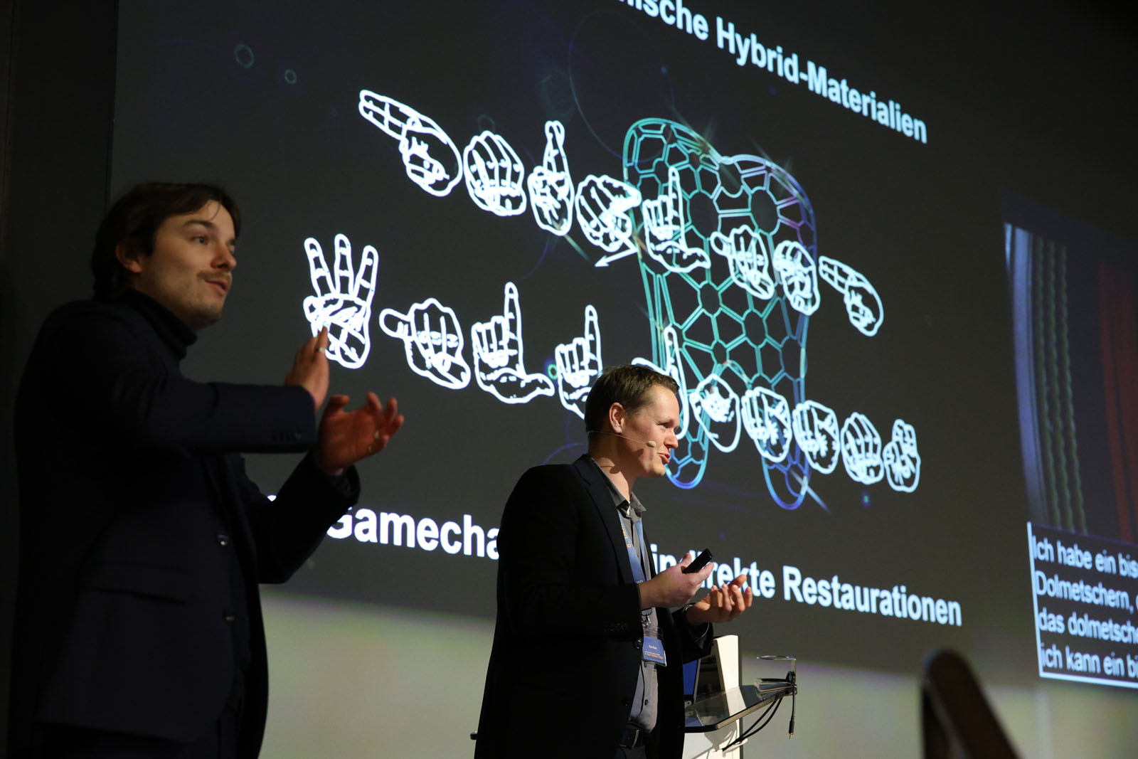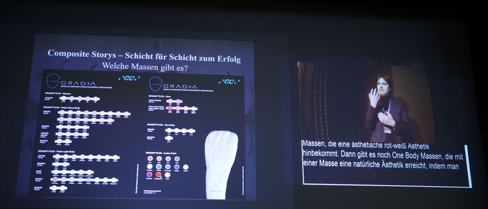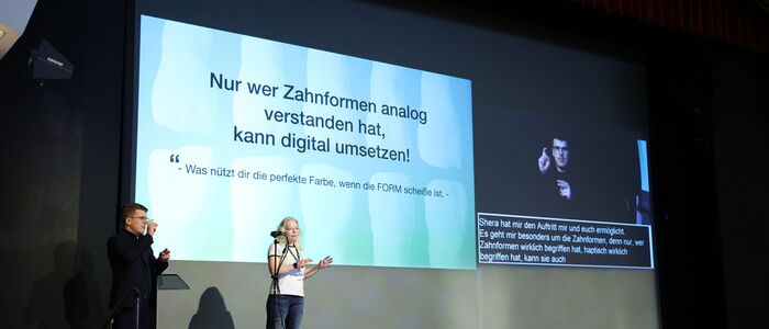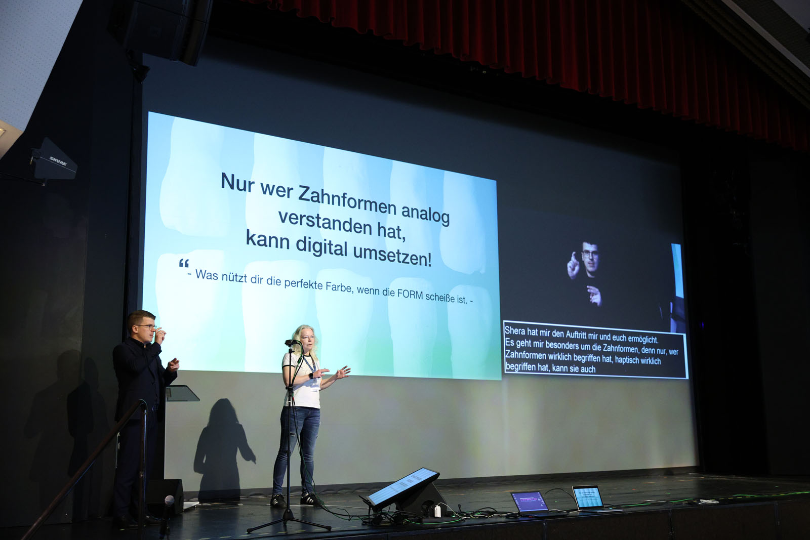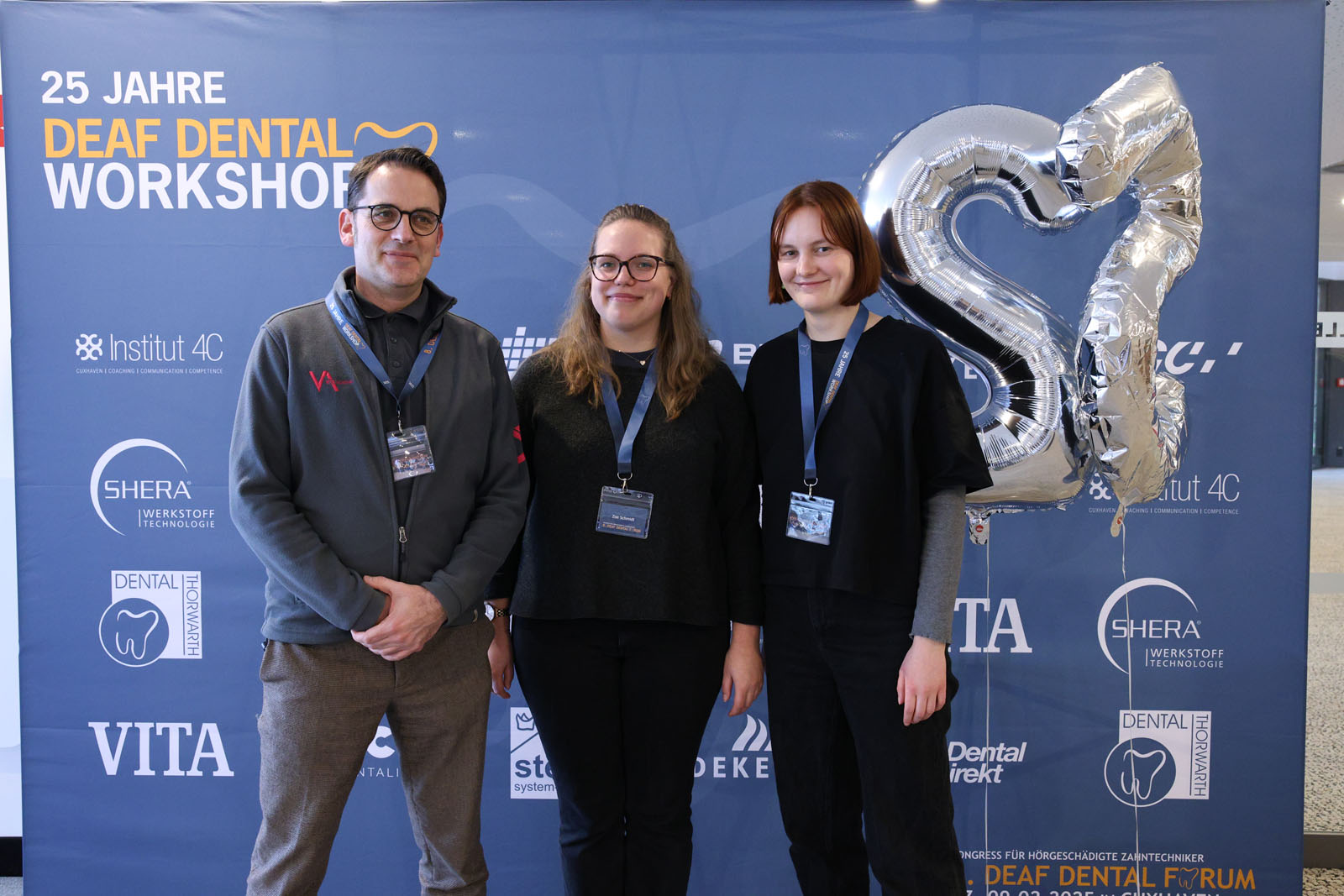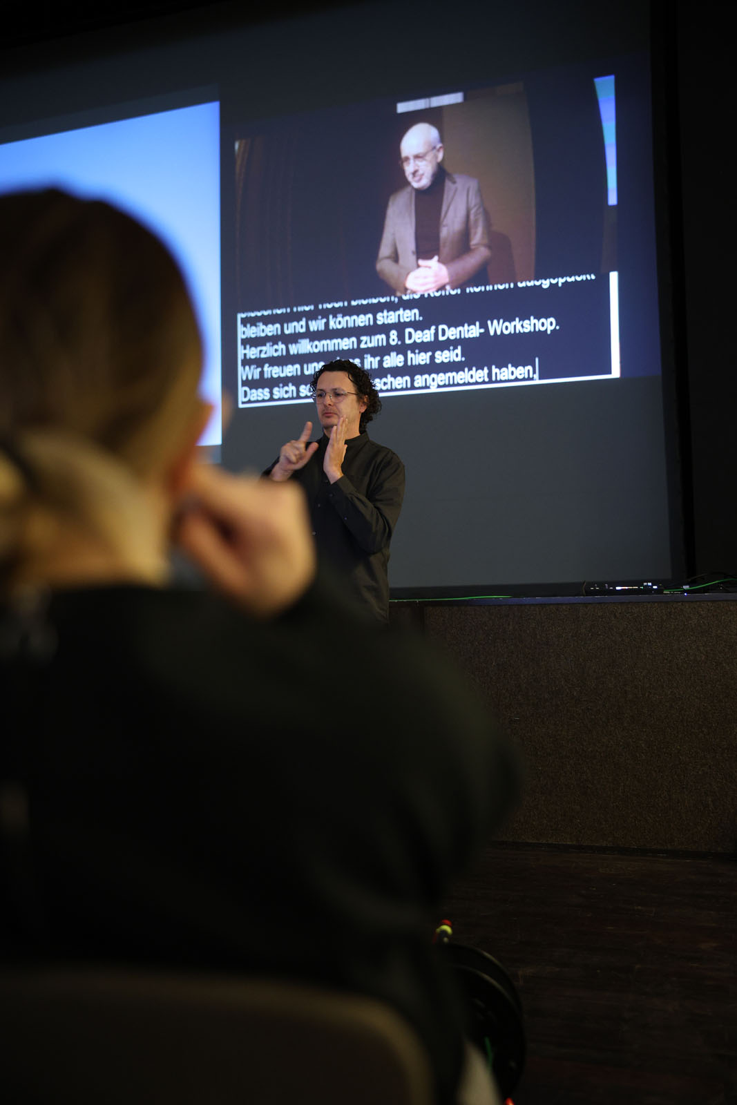 Damit alle Inhalte verständlich sind, sorgen vier Gebärdensprachdolmetscher und zwei Schriftdolmetscher für eine barrierefreie Kommunikation in nationaler und internationaler Gebärdensprache sowie in Schriftform. Zusätzlich unterstützen 15 studierende Gebärdensprachdolmetscher der Universität Hamburg die Fachberatungen an den Infoständen der Dentalfirmen. „Die Studierenden sammeln bei uns wertvolle Praxiserfahrung für ihre Zukunft“, so Thorwarth. Mit seinem Engagement verfolgt er ein klares Ziel: „Ich wünsche mir, dass alle gehörlosen Zahntechniker die Chance auf einen barrierefreien