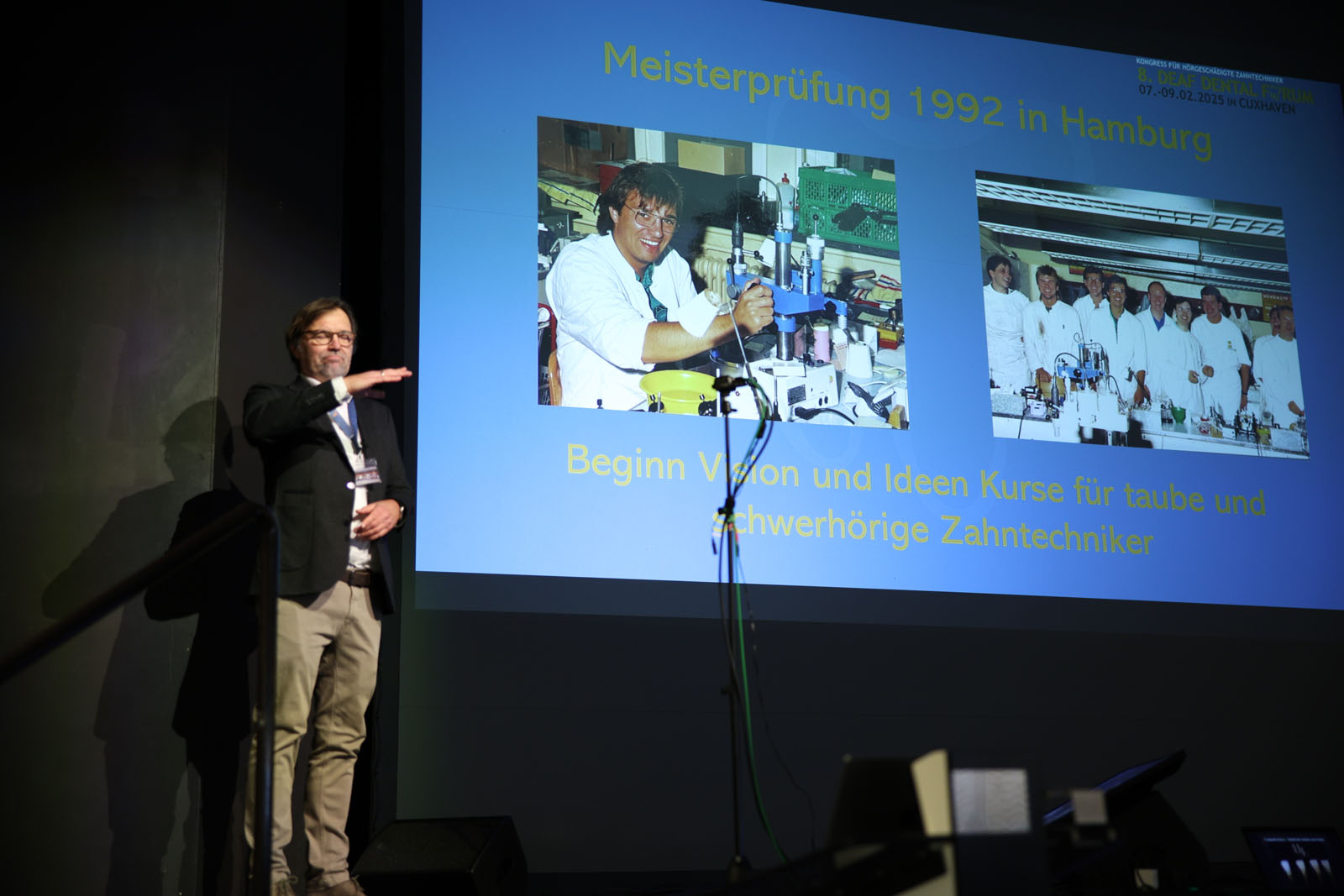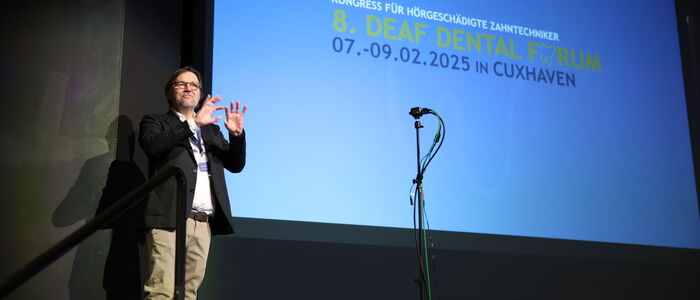 Trotz über 120 Teilnehmern herrschte eine ungewohnte Stille – denn zum achten Mal fand hier das „Deaf Dental Forum“ für taube und schwerhörige Zahntechniker statt. Zahntechnikermeister André Thorwarth führt seit 1999 ein eigenes Dentallabor in Cuxhaven und engagiert sich seit über 30 Jahren in der Weiterbildung. Sein Angebot richtet sich speziell an taube und schwerhörige Zahntechniker. In seinem Schulungszentrum, dem Deaf Dental Workshop, bietet er regelmäßig Fortbildungen an.